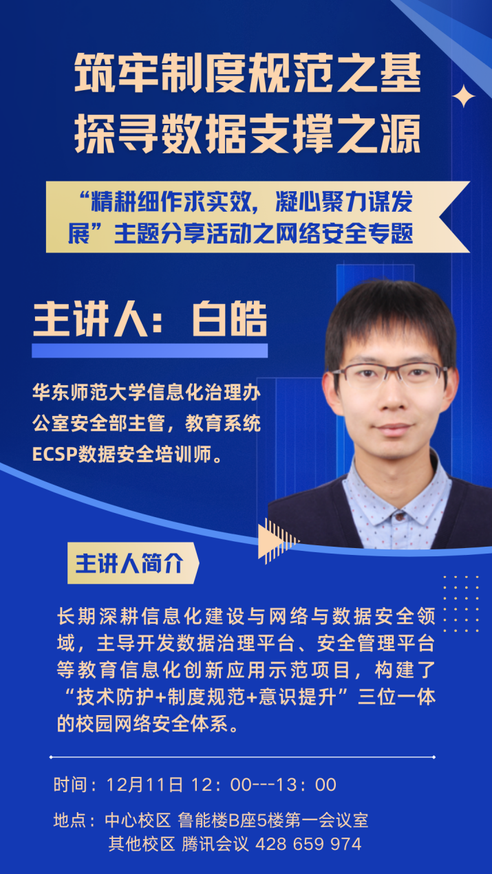 12月11日,数智化支撑研究院于一校三地同步举办第30期午餐研讨会暨第2次数据安全学习研讨会。本次研讨会特邀华东师范大学信息化治理与数据安全领域专家白皓老师作题为“筑牢制度规范之基,探寻数据支撑之源”的专题报告。研究院院长郭晓东、副院长于磊磊,一校三地信息化部门工作人员参加午餐会,并与白皓老师进行深入交流与指导。