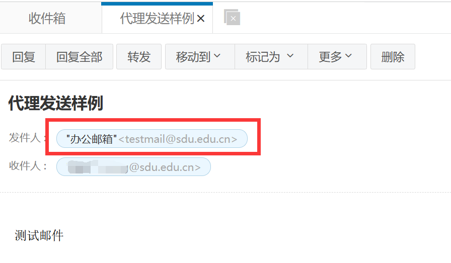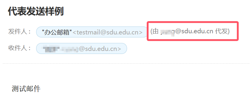 4、设置成代表发送,共享人发送邮件后,发件人除显示办公邮箱地址外,在发件人后方会标注共享人的个人账号。