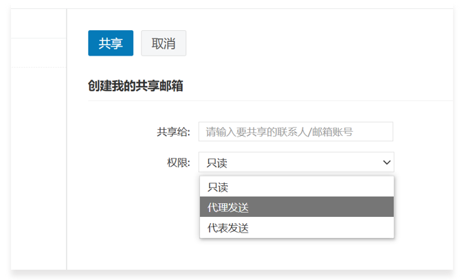 然后根据操作需要,选择只读、代理发送或代表发送。
