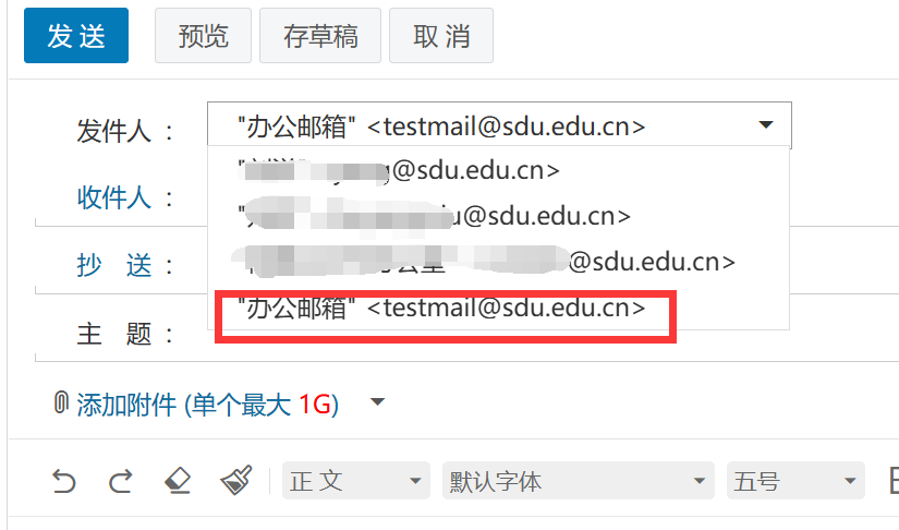2、共享人代理或代表办公邮箱发送邮件时,需要在发件人下拉菜单中选中共享的办公邮箱地址。