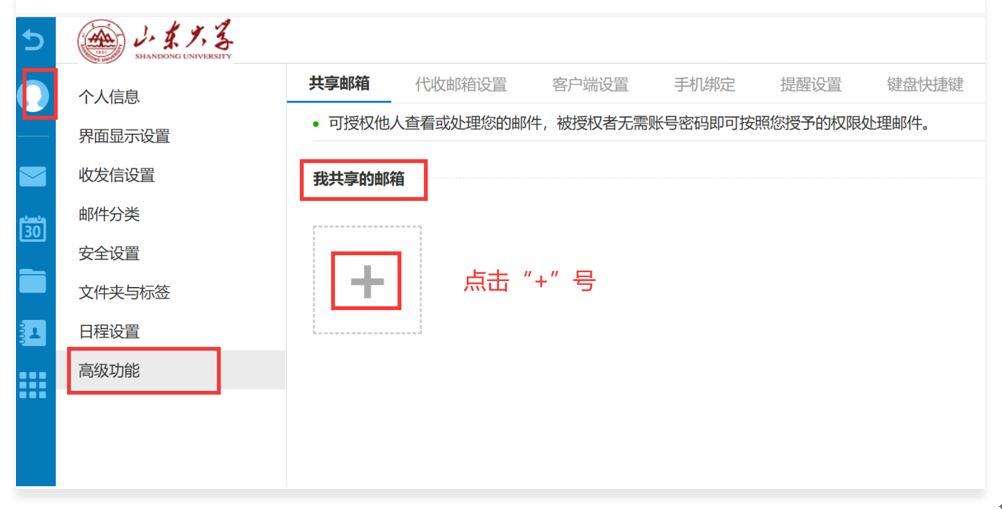 1、登录需要被共享的邮箱,选择个人设置-高级功能-我共享的邮箱,点击“+”号,进入设置界面。